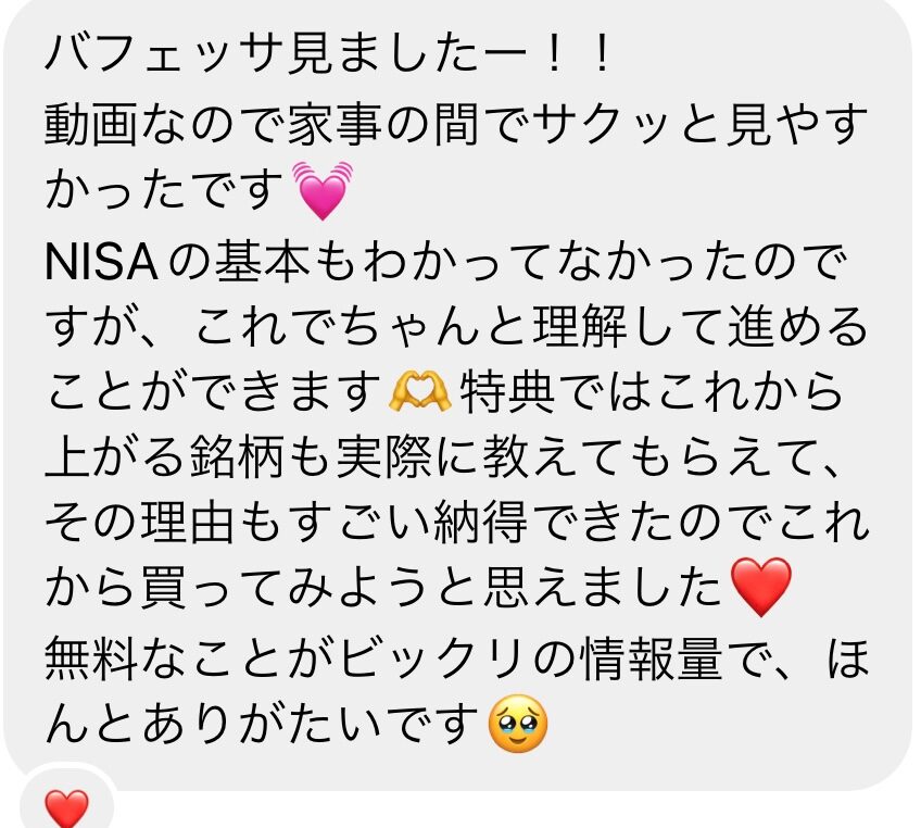 実際にバフェッサを視聴したフォロワーさんからいただいた口コミを、一部抜粋して紹介するね!