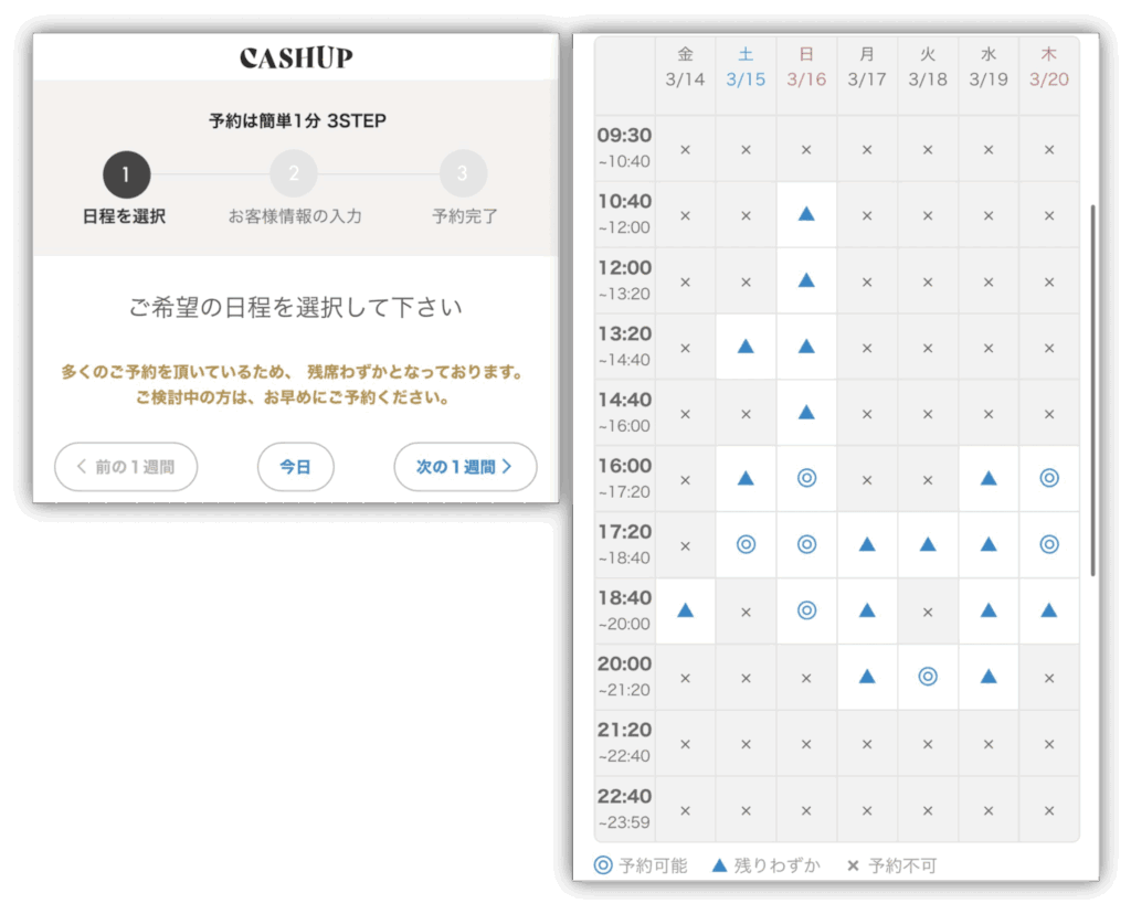 CASHUPは、無料でプロからマンツーマンで教えてもらえるのが魅力だけど、そのぶん人気の日程はすぐに埋まってしまうこともあるよ😭