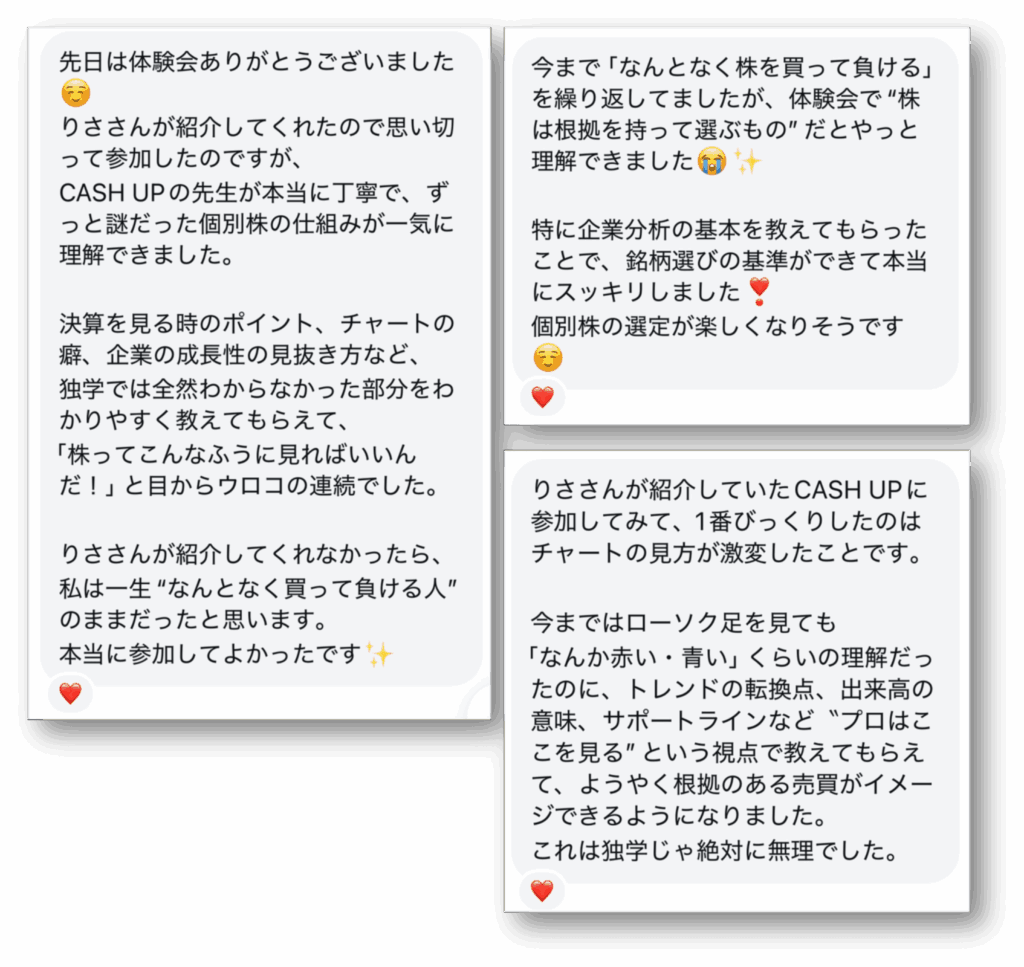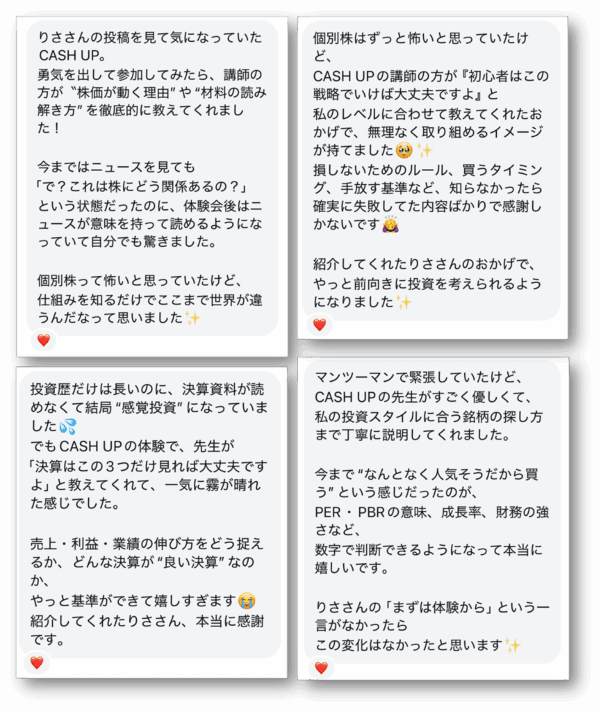 CASHUPで学んだことは、今後も実践として使える内容ばかりで有益だったから、ぜひみんなにも体験してほしいな💓