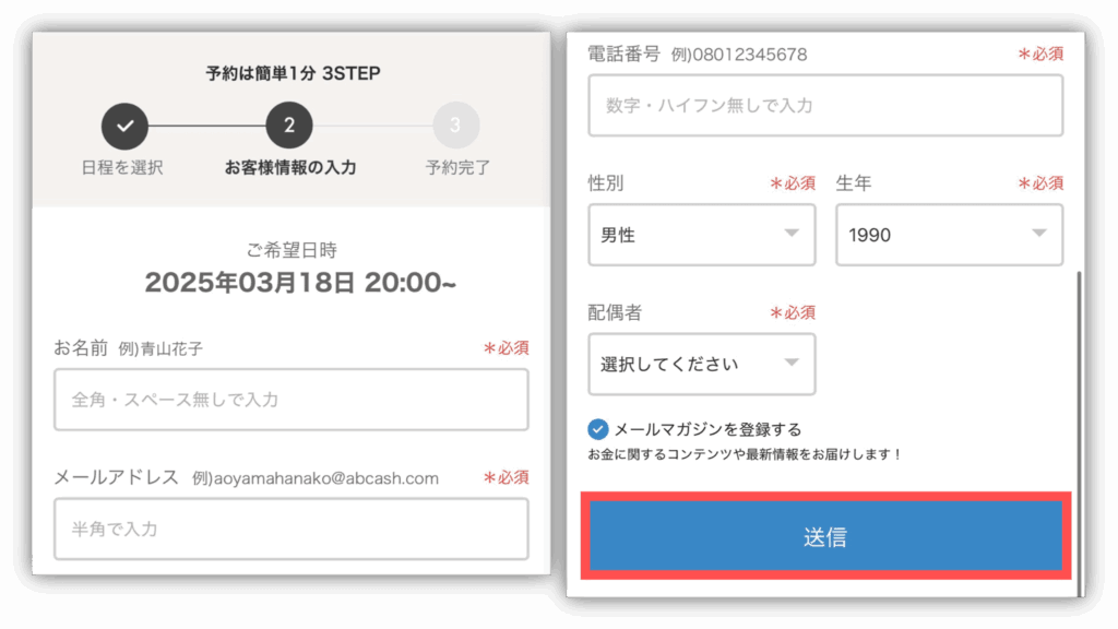 続いて、氏名・メールアドレスなどのお客様情報を入力していくよ✨