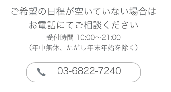 予約画面で希望の日程が空いていなくても、電話で相談すれば日程調整してもらえる場合があるよ🍀