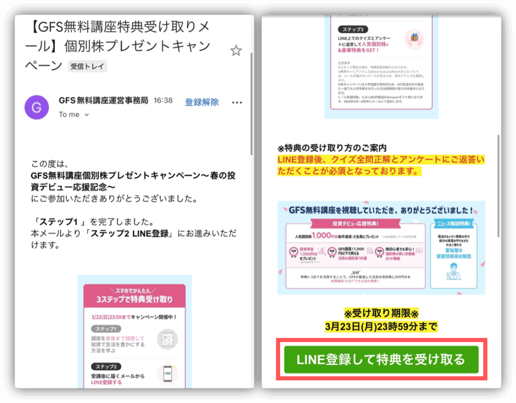 動画を視聴完了すると、最初に登録したメールアドレスに「GFS無料講座受け取りメール」が届く!