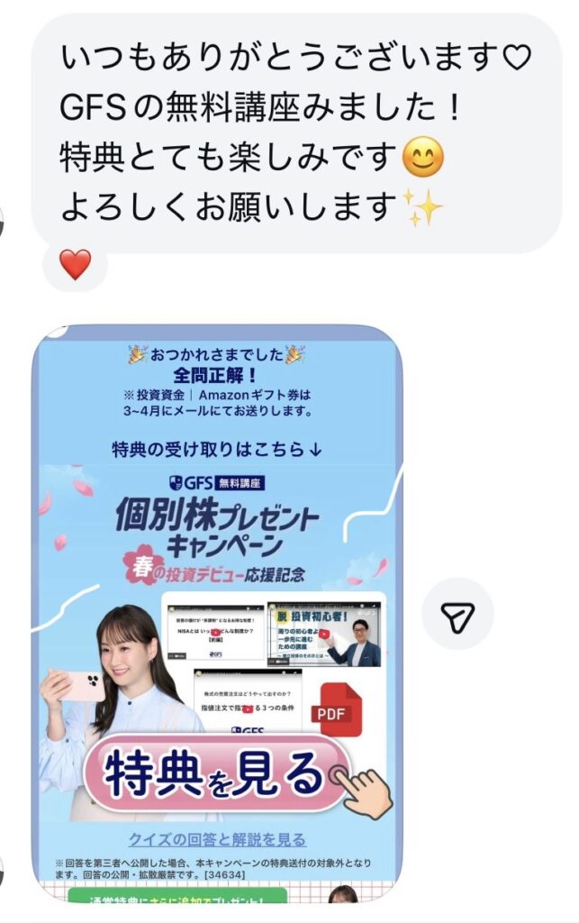 さらに、GFS無料講座(旧バフェッサ)のクイズの結果画面をスクショして、りさのインスタDMに送ってくれた方には、りさオリジナル特典を2つプレゼント🎁