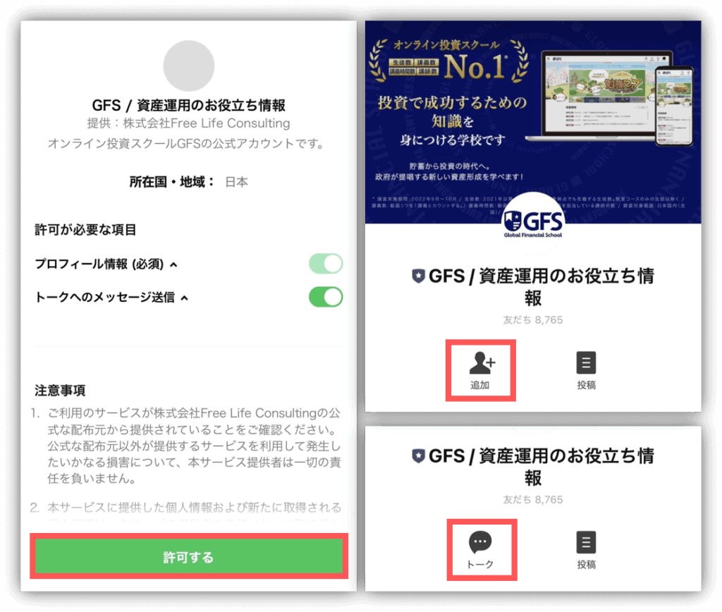 GFSの公式LINEは、「許可する→追加→トーク」の順で登録してね📲