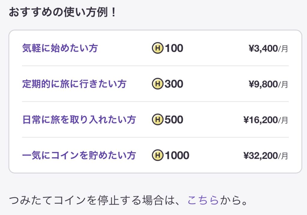 旅行したいときは500コイン(16,000円)つみたてて、しばらく予定がない月は100コイン(3,200円)だけにするって使い方もOK👍