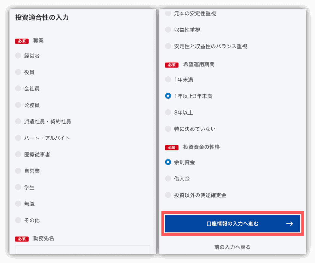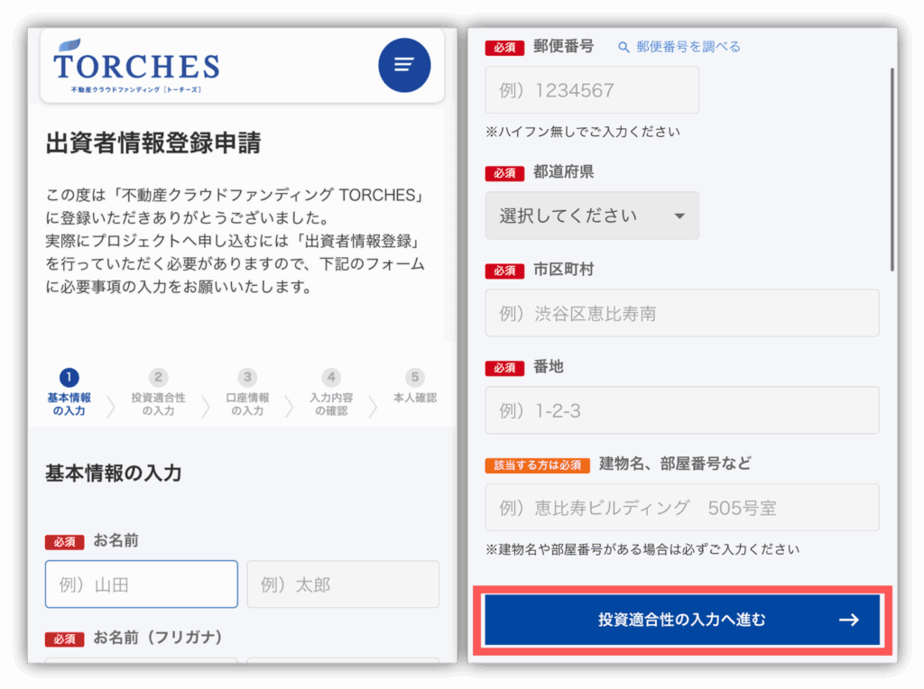 名前や住所などの基本情報を入力し「投資適合性の入力へ進む」をタップ!