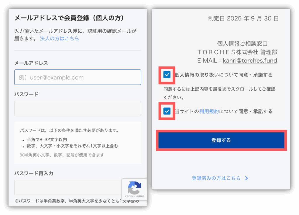 メールアドレスとパスワードを入力して、利用規約等に同意するチェックを入れたら「登録する」をタップ!