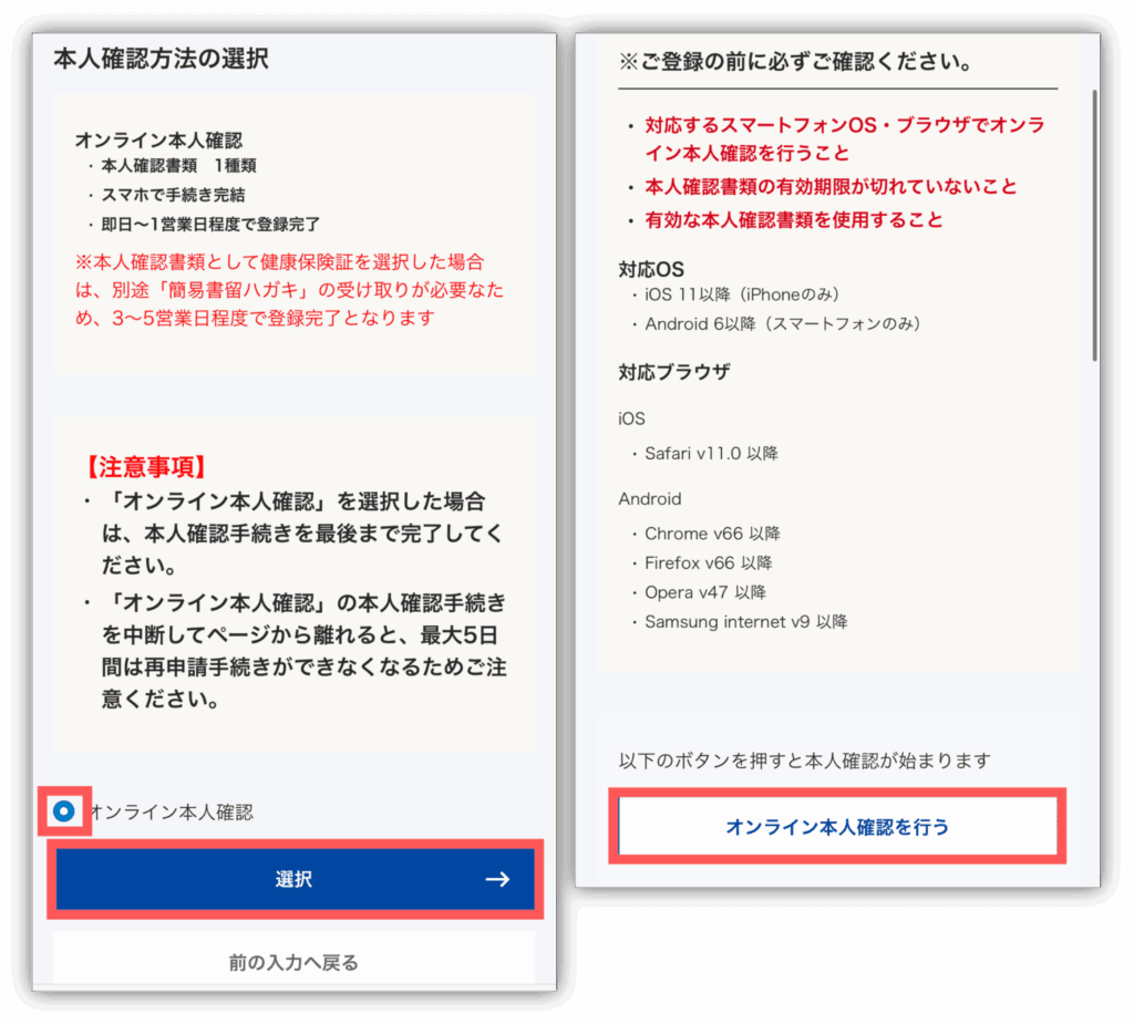 「オンライン本人確認」を選んで「選択」をタップしてね。
