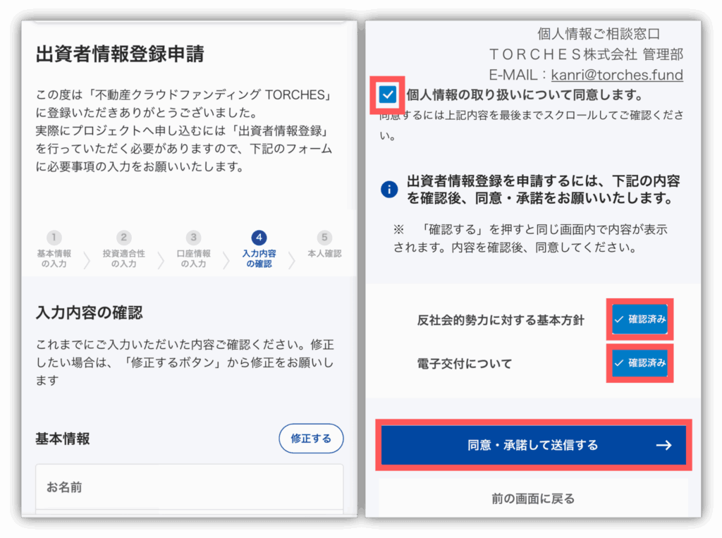 問題がなければ、個人情報の取り扱いに同意するチェックを入れて、2つの書類を確認したら「同意・承諾して送信する」をタップ💖