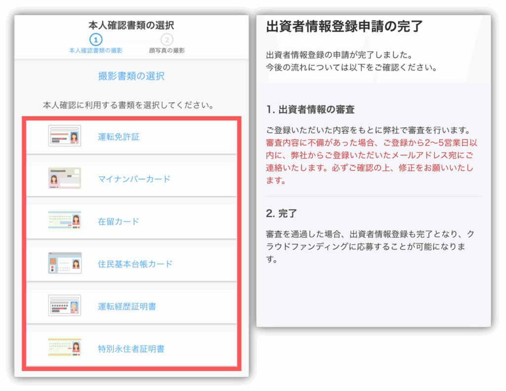 撮影が無事終われば「出資者情報登録申請の完了」が表示されるよ👏